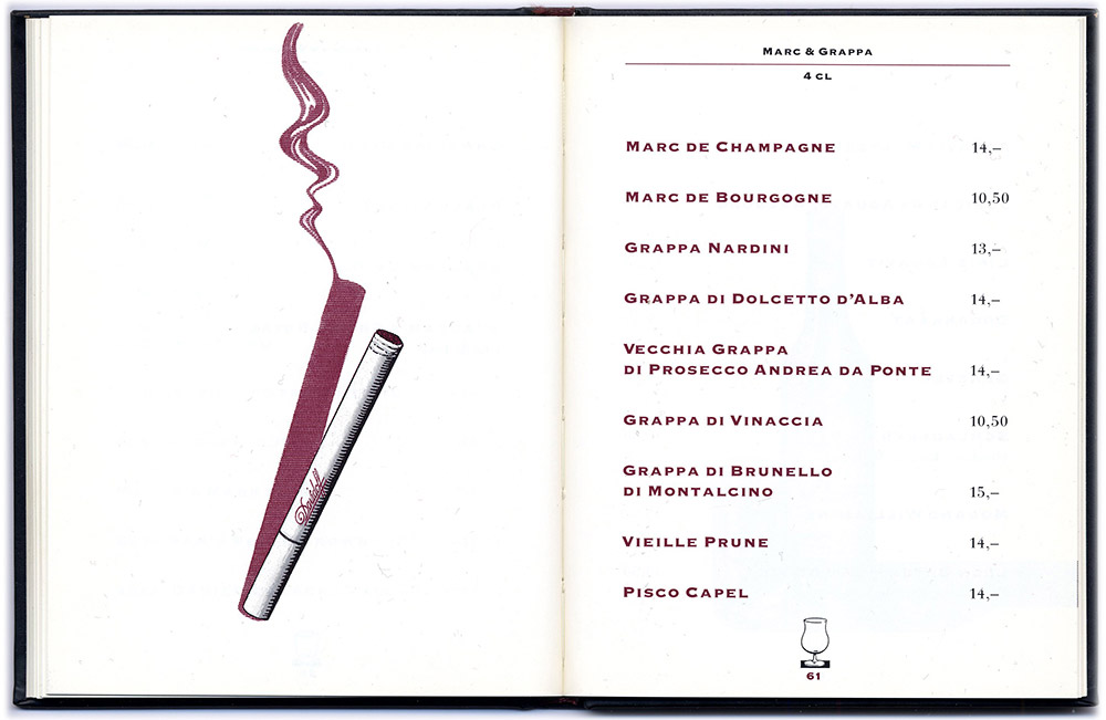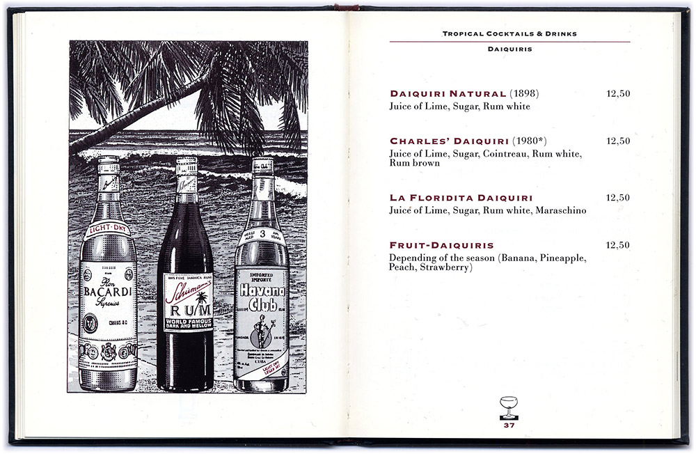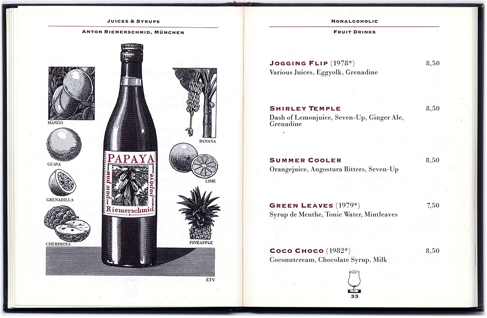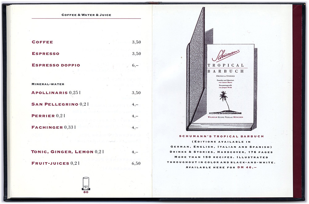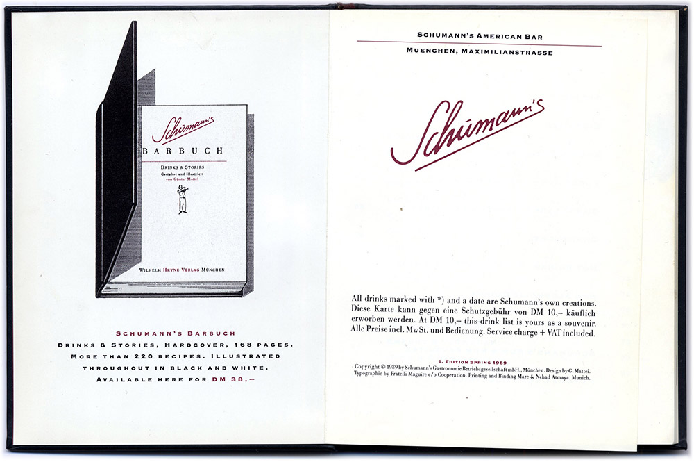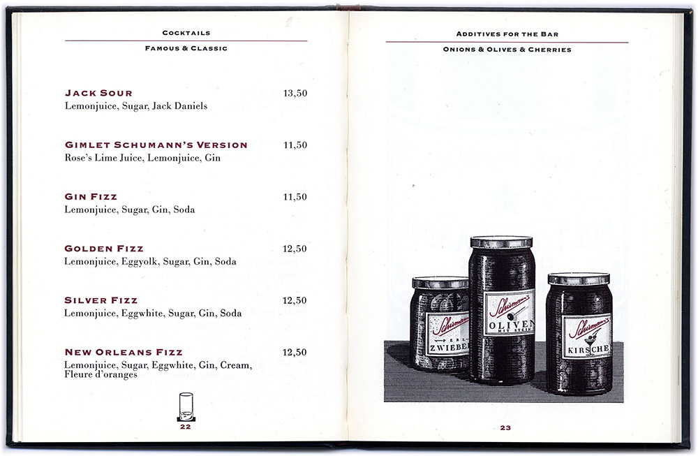 Ich illustrierte das Büchlein neben anderem auch mit fiktiven Anzeigen für Schumann’s Produkte. Charles hatte die Idee, eine eigene Range von Schumann’s–Produkten auf den Markt zu bringen. Es blieb beim Wunsch, hauptsächlich als Folge des Tagesbetriebs der Bar mit den vielen wechselnden Anforderungen und letztendlich wohl auch aus „mangelnder Geschäftstüchtigkeit“. Ich entwarf und gestaltete übrigens auch die „richtigen“, bezahlten Anzeigen und wenn uns eine Originalflasche aber z.B. nicht gefiel, entwarf ich kurzerhand etwas Neues. Diese Barkarte setzte inhaltlich und formal neue Massstäbe in der Barszene und wurde damals leider auch oft kopiert...