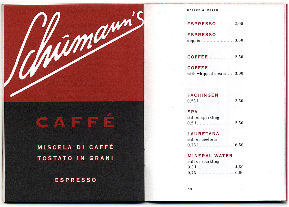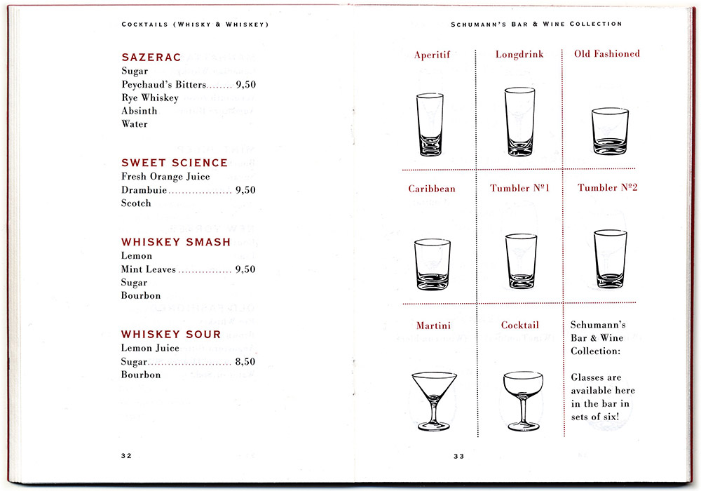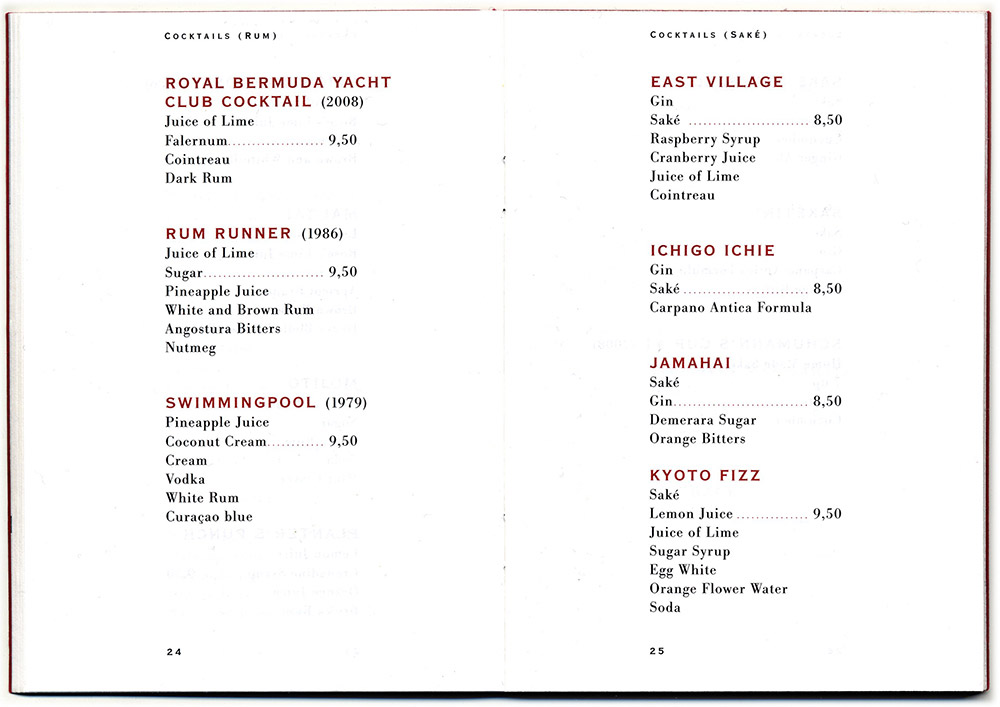 Für diese neue Karte veränderte ich auf Wunsch von Charles das Layout. Er wünschte sich den jeweiligen Namen des Cocktails und die Ingredienzien der besseren Lesbarkeit wegen unter einander geschrieben. Grundsätzlich kein Problem, aber bei dieser Darstellung konnte ich maximal 3–4 Cocktails anstelle von 6 – wie bisher – unterbringen. Gleichzeitig sollten wir aber den Kartenumfang verkleinern? Was tun? Drinks streichen? Format vergrößern? Der „Findungsprozess“ dauerte seine Zeit und es verging bestimmt wieder mal ein Jahr, bis wir mit dieser neuen Karte in Druck gehen konnten!